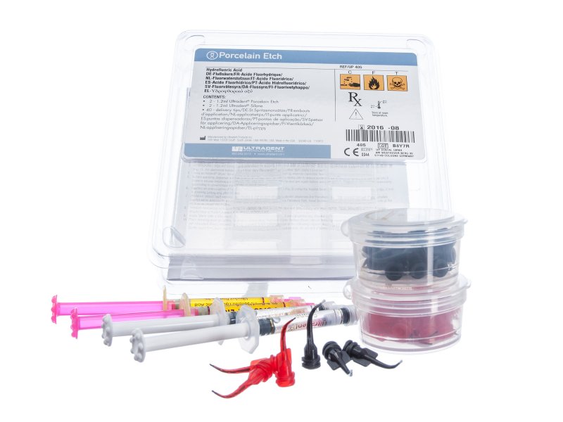 Ultradent Porcelain Etch je pufrovaná kyselina fluorovodíková vo forme gélu k opatrnému použitiu pre intraorálne a extraorálne leptanie porcelánu. Porcelain Silan je jednozložkový roztok pre zvýšenie väzobných síl.
