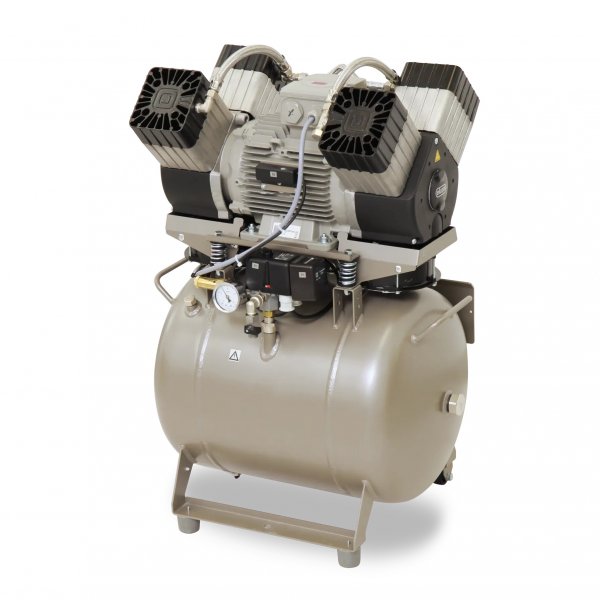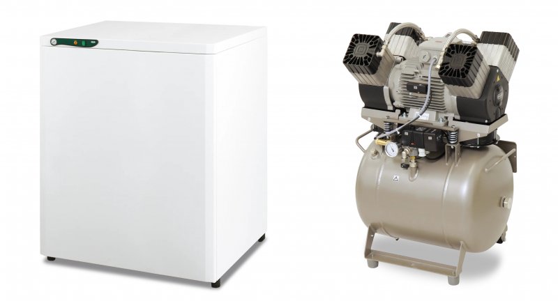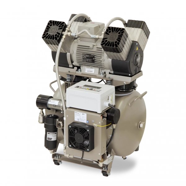 Ultra kompaktný kompresor pre štyri súpravy alebo iné zariadenia v dentálnych laboratóriách, kde sú vysoké nároky na spotrebu vzduchu. Nízka hlučnosť skrinkového prevedenia ho umožňuje umiestniť aj priamo do ordinácie.